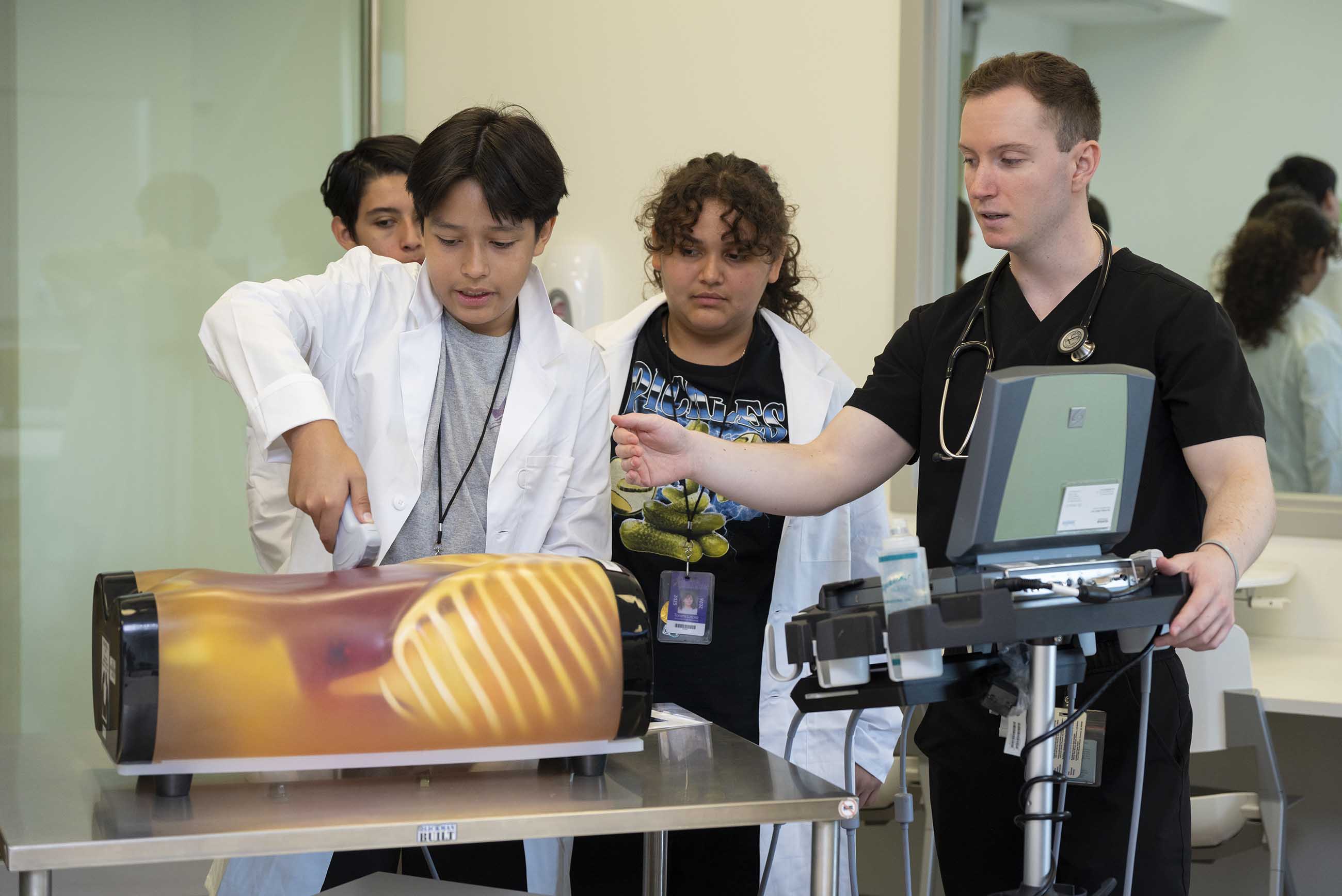 After slipping on white doctor’s coats, students had the chance to use ultrasound machines, see what it’s like to perform laparoscopic surgery and conduct an eye exam. They even got a crash course in CPR.